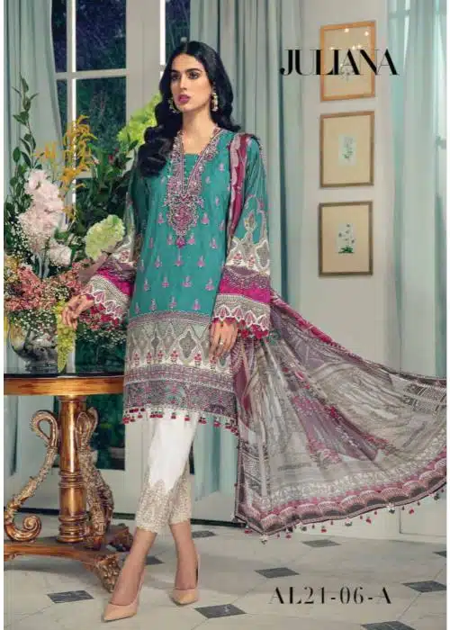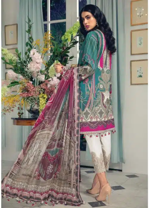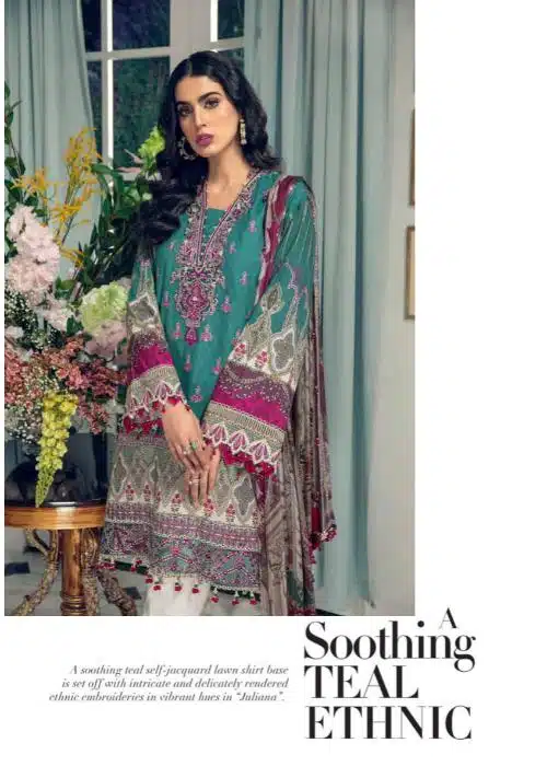 - Work: Features embroidered jacquard shirt front, digital printed lawn shirt back, and embroidered borders on the front daman, sleeves, and neckline. The trousers include an embroidered border, while the silk dupatta features digital prints.