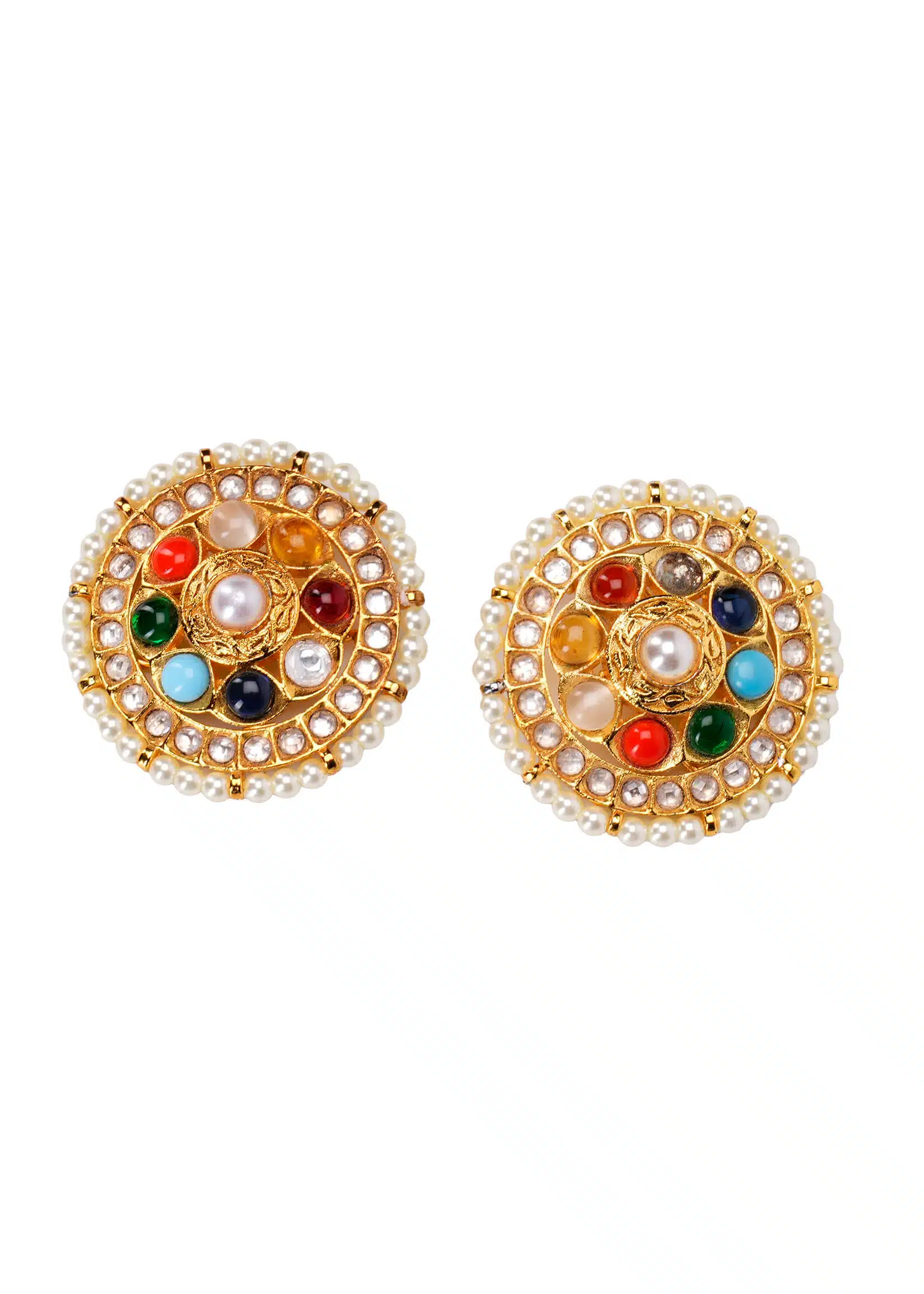 Celebrate tradition with these stunning gold-plated Navratna stud earrings, featuring nine sacred gemstones arranged in a divine floral pattern. Encircled by a delicate pearl border, these statement studs blend heritage with timeless elegance, making them a must-have for any jewelry collection. |