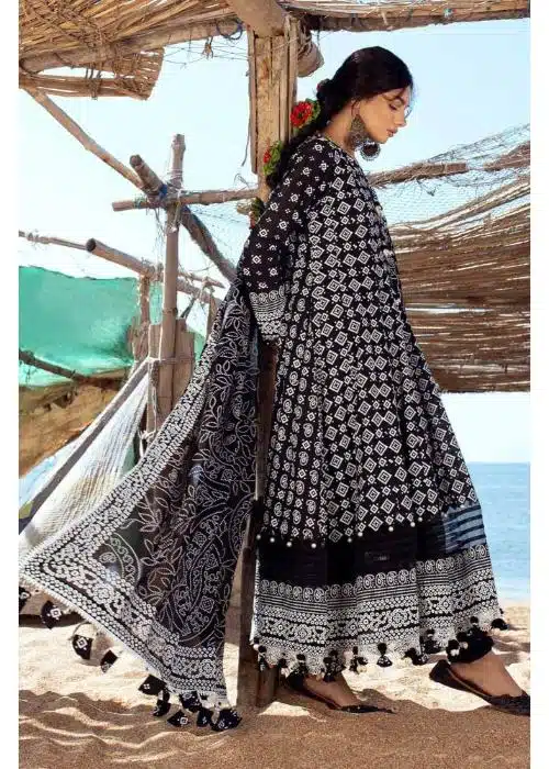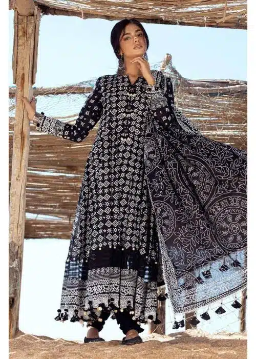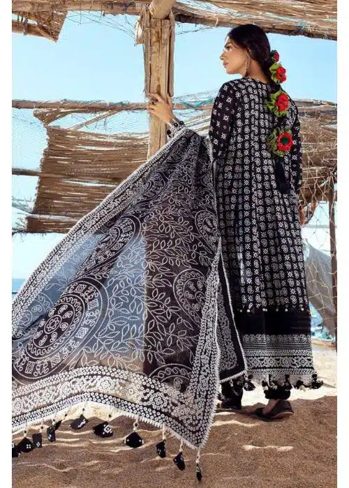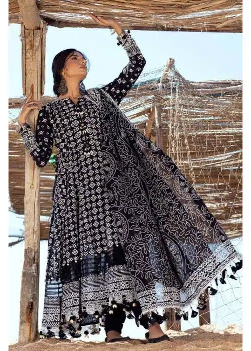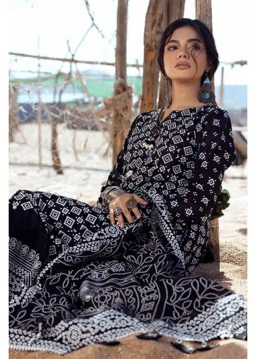- Work – Kurta printed with bandhani design in white; dupatta printed with bandhani design in white; trouser dyed in black.