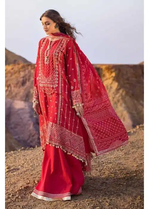 - Work – Burnout tissue silk dupatta, zari & sequins embroidered lawn shirt front panel, side panels, & sleeves with zari & sequins embroidered borders for front & back, dyed back, dyed trouser.