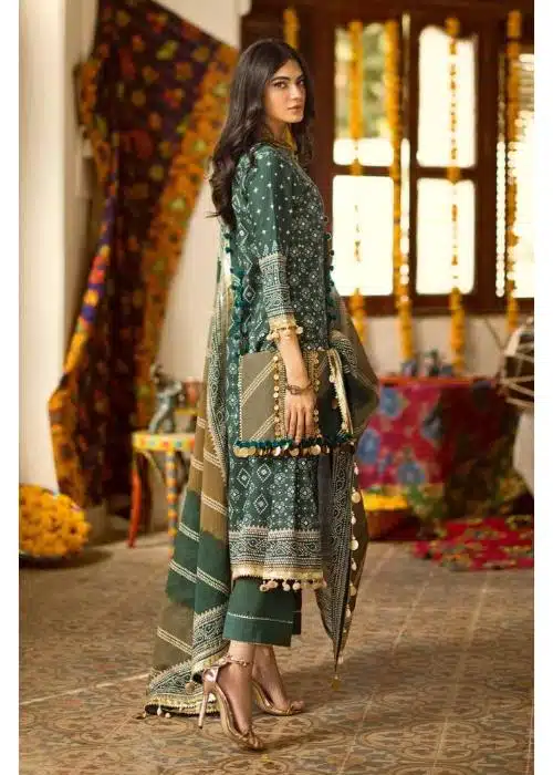 - Work – Kurta printed with bandhani design in golden and white; dupatta printed with bandhani design in golden with white; trouser dyed in dark green.