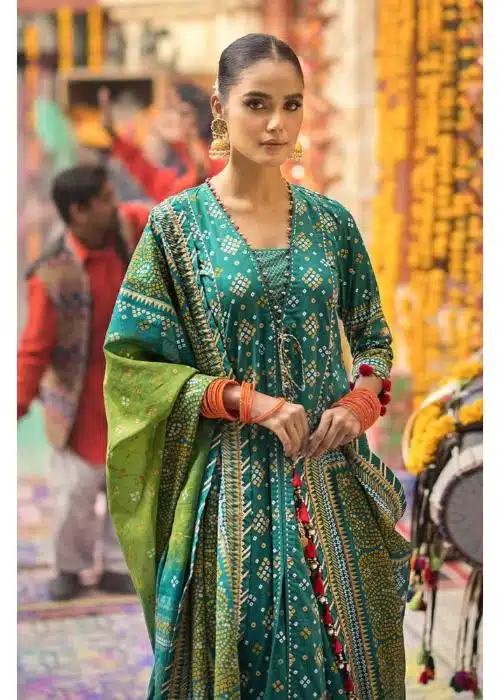 - Work – Bandhej design gold print lawn shirt with chunri design; gold print lawn dupatta; simple trouser.