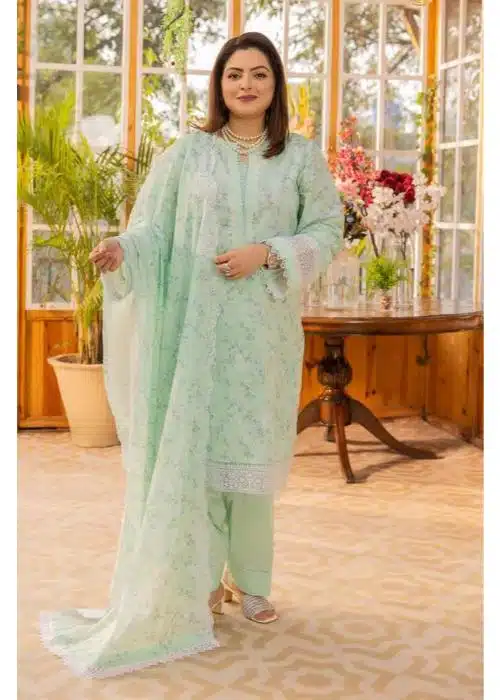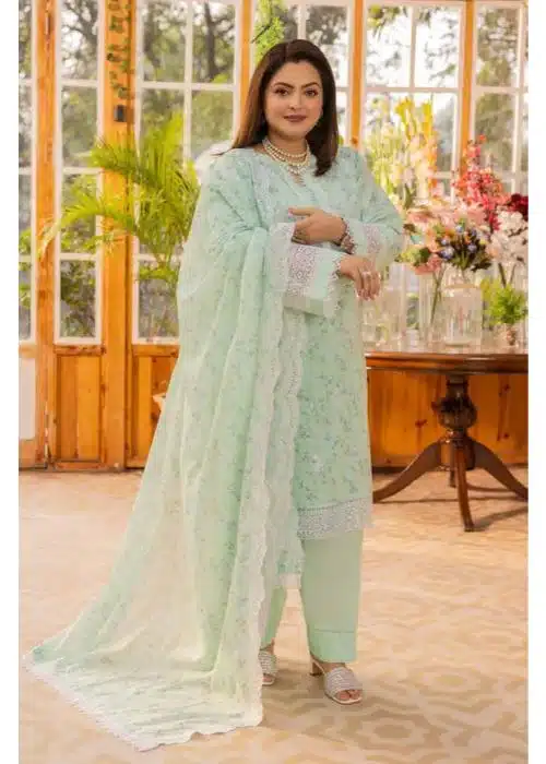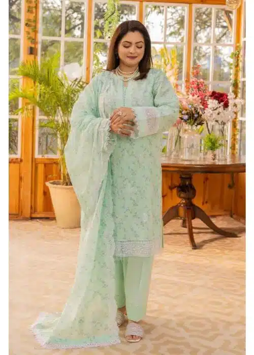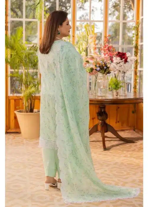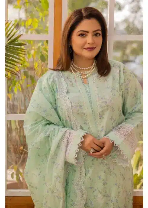 - Work – Embroidered printed denting lawn dupatta with coordinating lace, embroidered printed lawn shirt front with printed back and sleeves on organza, plain trouser.