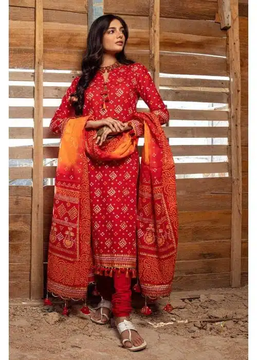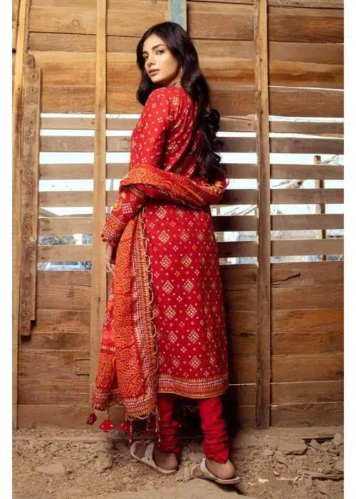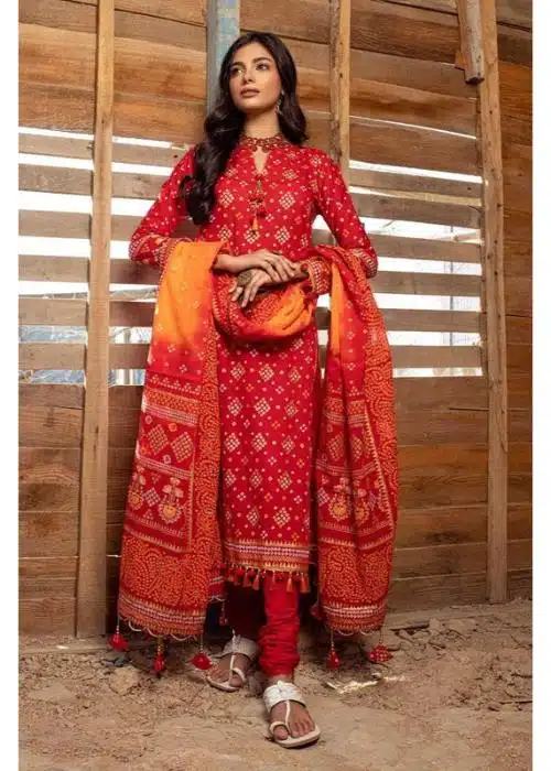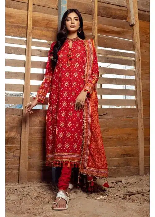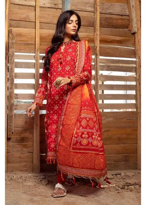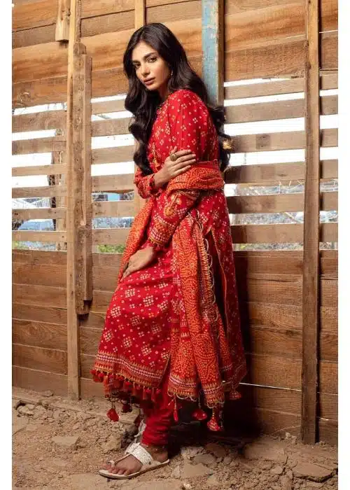 - Work – Kurta printed with bandhani design in gold and white; dupatta printed with bandhani design in gold, white, and orange; trouser in red.