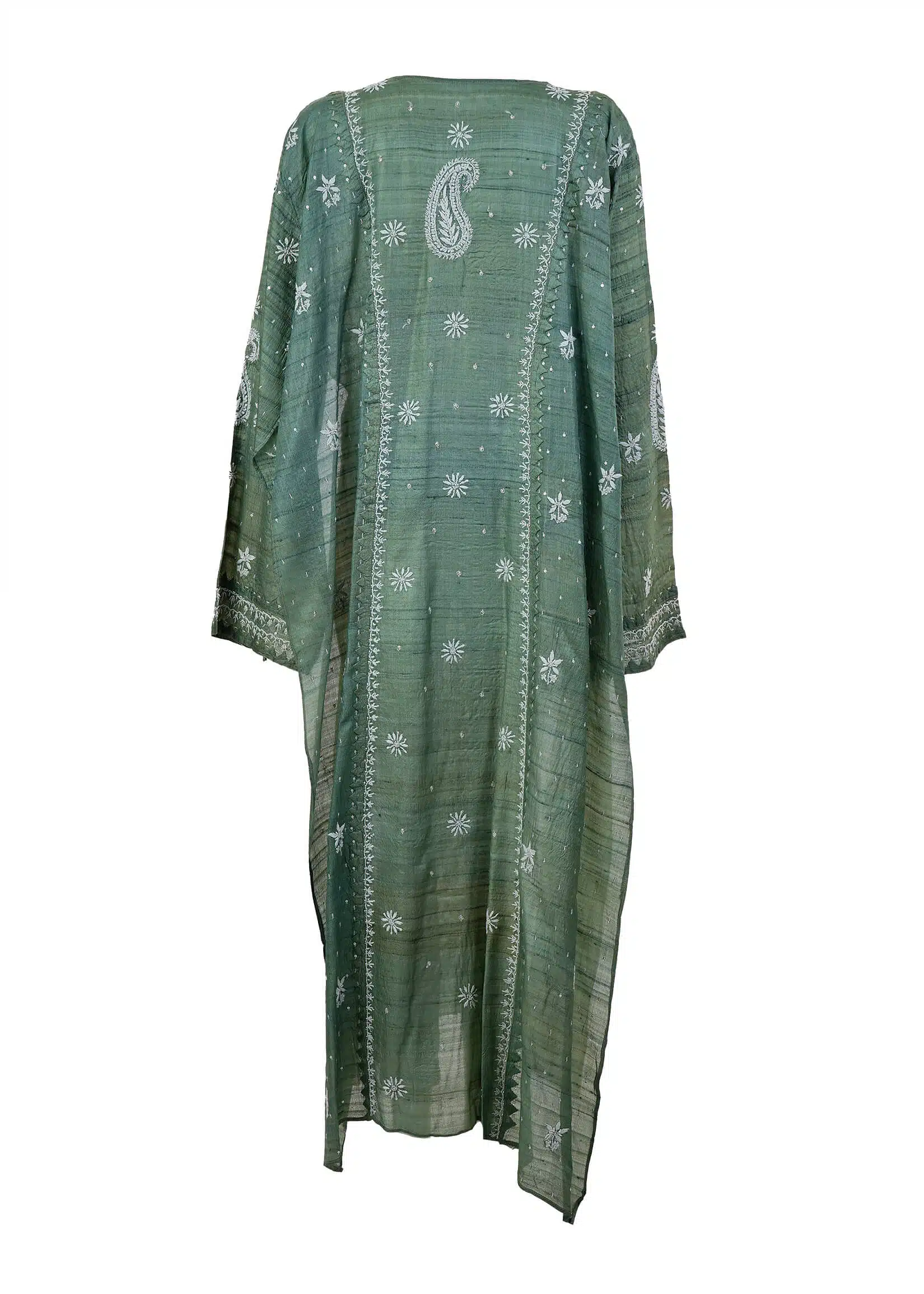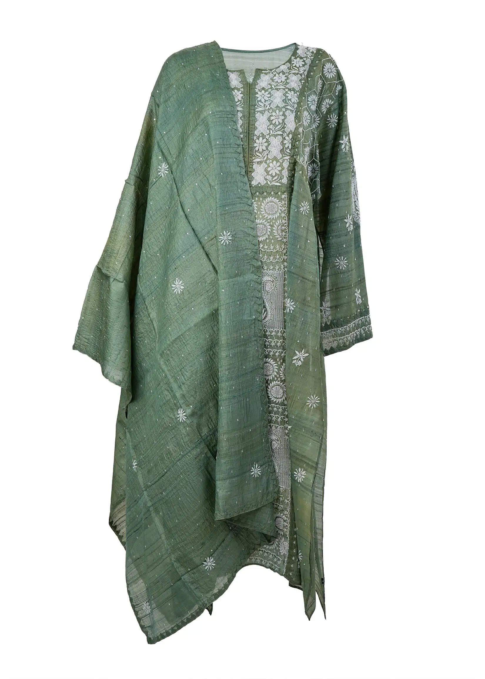 - Dupatta – Tussar silk with two-side border thread handwork on the pallu, adorned with boota designs throughout.