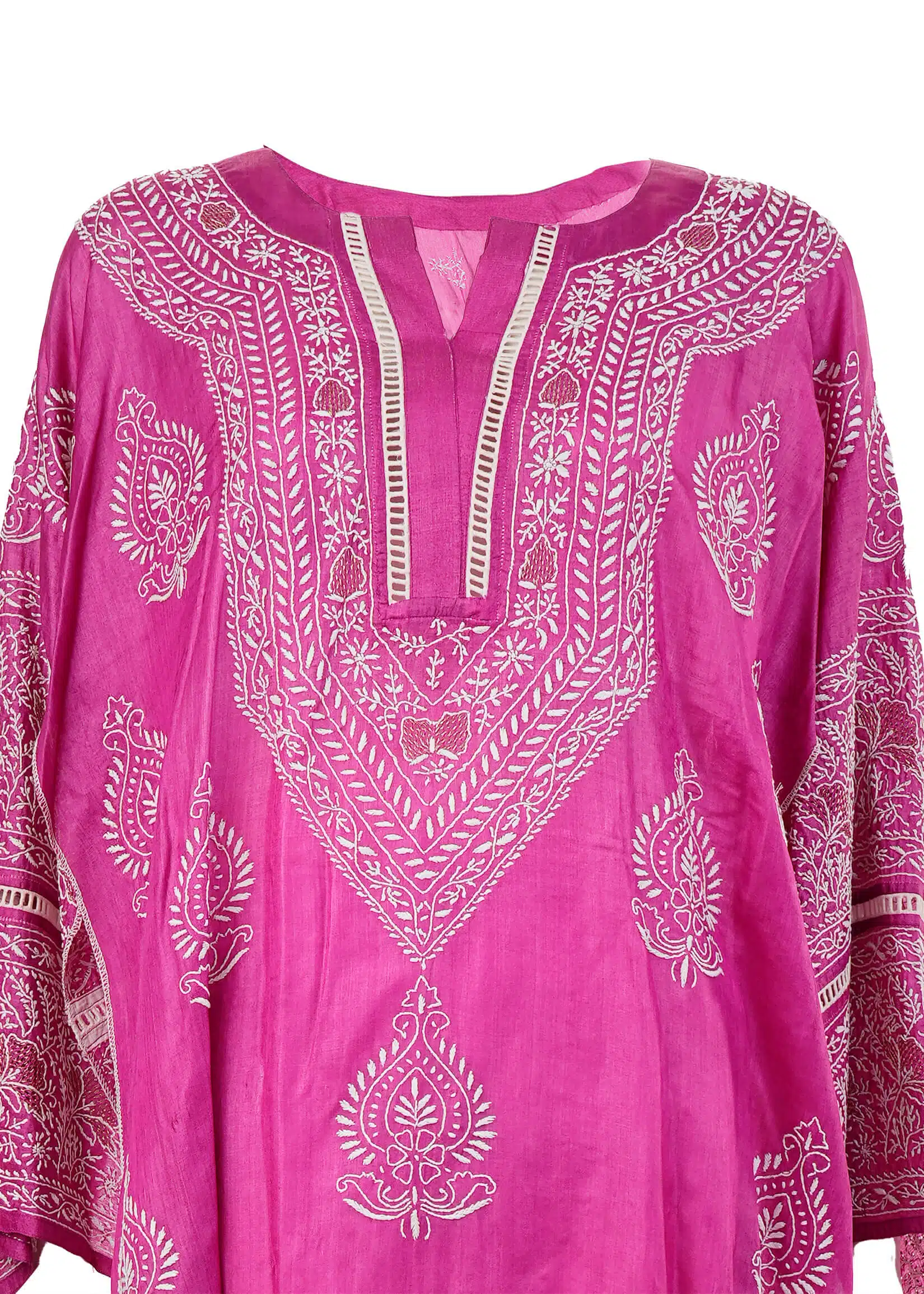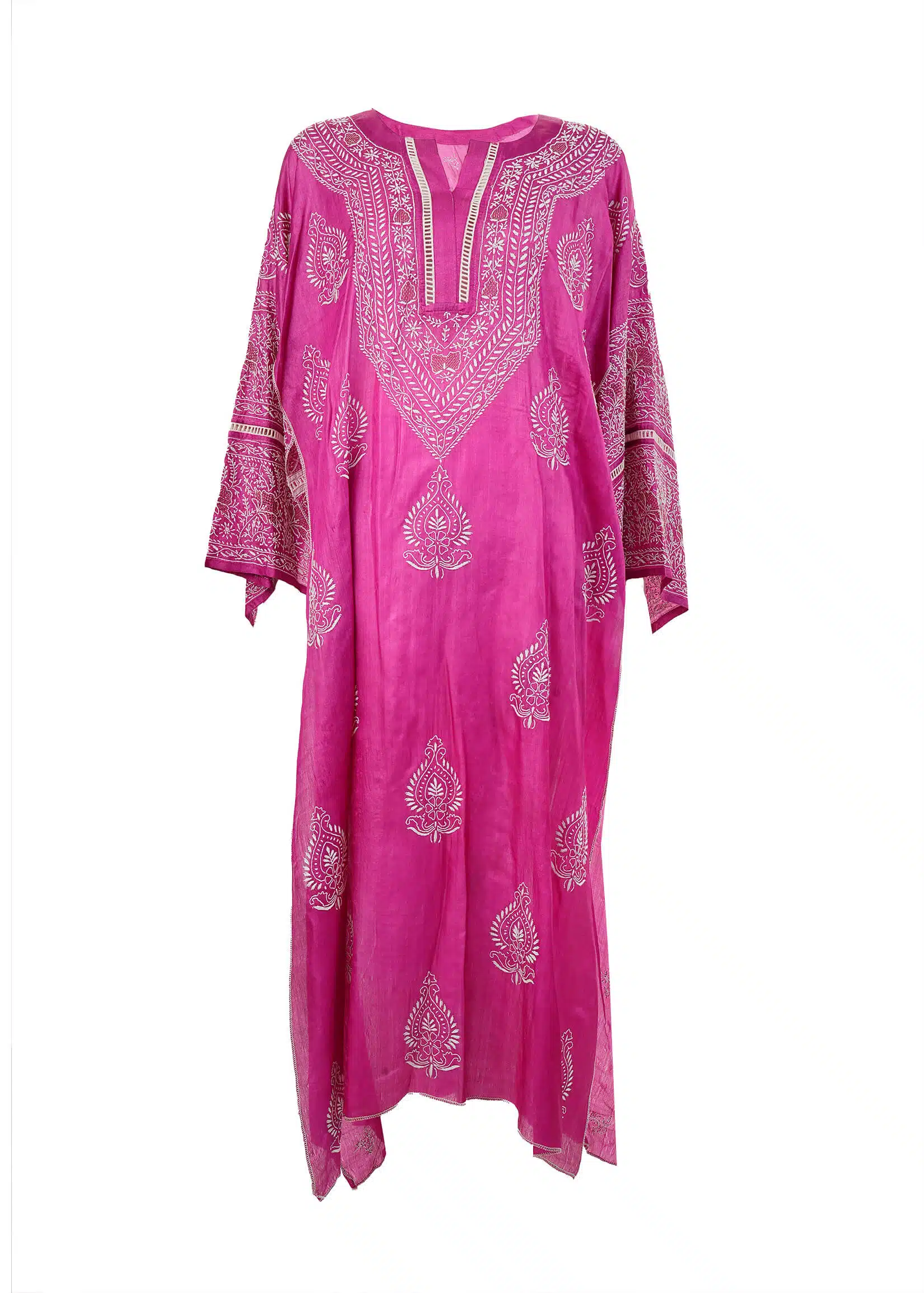 - Work – Orange and peach thread handwork featuring full front design, with detailed borders on sleeves and back.