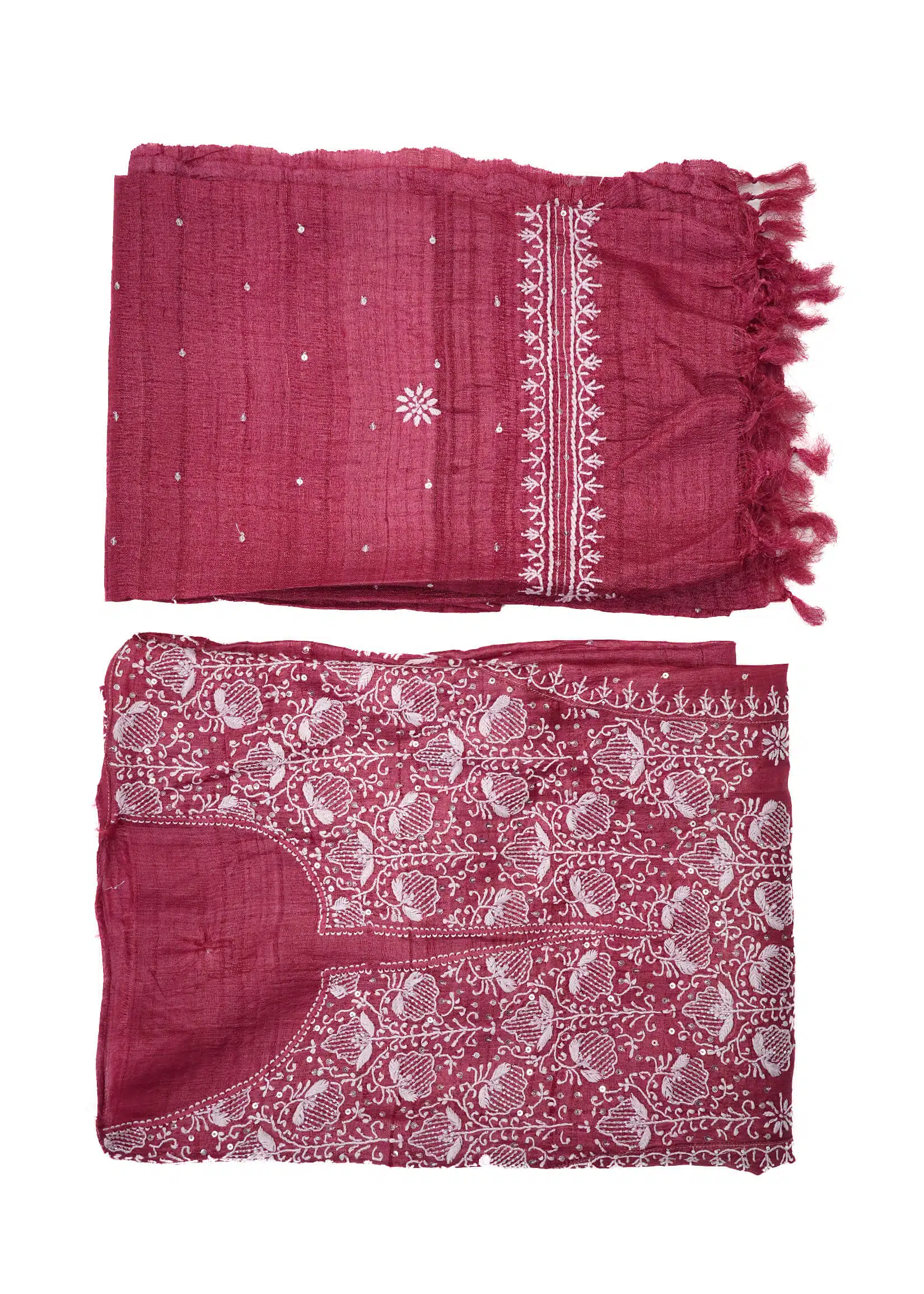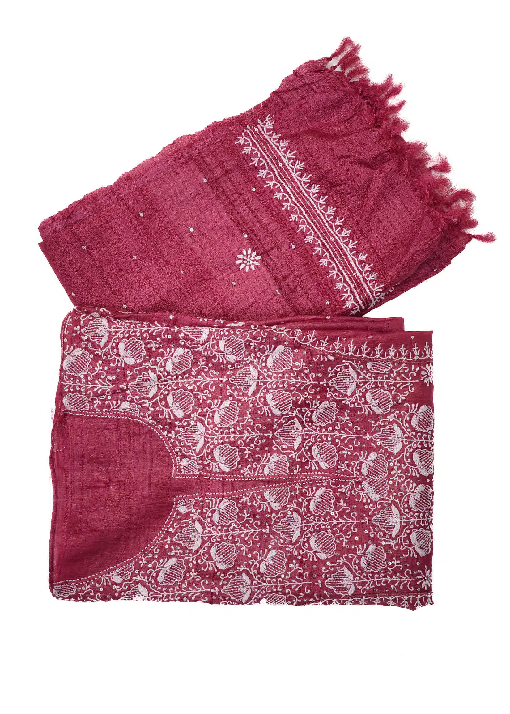 - Dupatta – Tussar silk with two-side border thread handwork on the pallu, complemented by boota designs throughout.