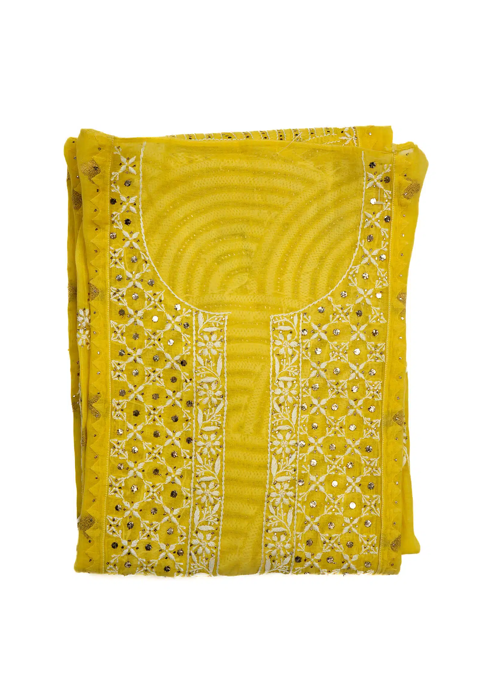 - Work – Antique Mukesh handwork with off-white thread handwork featured on the front, full top, sleeves, and back.