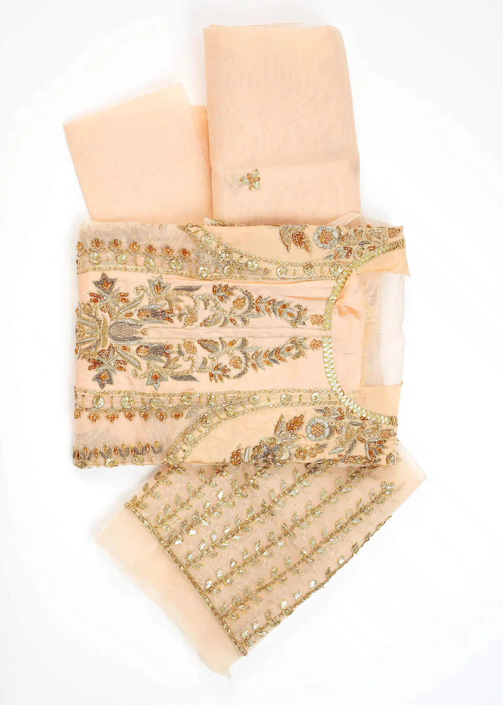 Ideal Gift | This beige chiffon kurta set, featuring exquisite machine embroidery and a touch of pearls and dapki work, is an excellent gift for festivals and special occasions, blending tradition with modern elegance. |