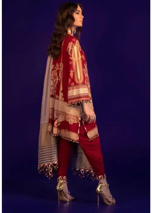 Ideal Gift A luxurious maroon cotton lawn suit with gold print and delicate embroidery, perfect for gifting someone on a special occasion or festival, blending elegance with modern sophistication.