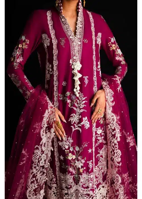 • Work: Schiffli embroidered front panel on lawn with Schiffli daman border. Dyed and embroidered neckline on organza. Dyed and embroidered side Kali and sleeves on lawn with embroidered organza sleeve border. Dyed back on lawn with embroidered back border on organza. Woven net dupatta with dyed and embroidered detailing and pallu on organza. Dyed lawn pants for a complete look.