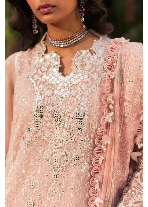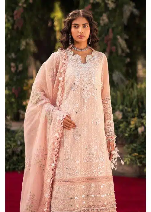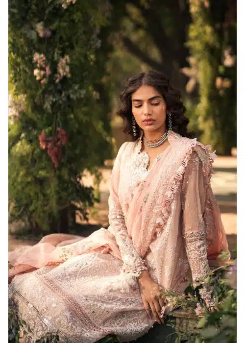 • Work: Schiffli embroidered front panel on lawn with Schiffli daman border. Dyed and embroidered neckline on organza. Dyed and embroidered side Kali and sleeves on lawn with embroidered organza sleeve border. Dyed back on lawn with embroidered back border on organza. Woven net dupatta with dyed and embroidered detailing and pallu on organza. Dyed lawn pants for a complete look.